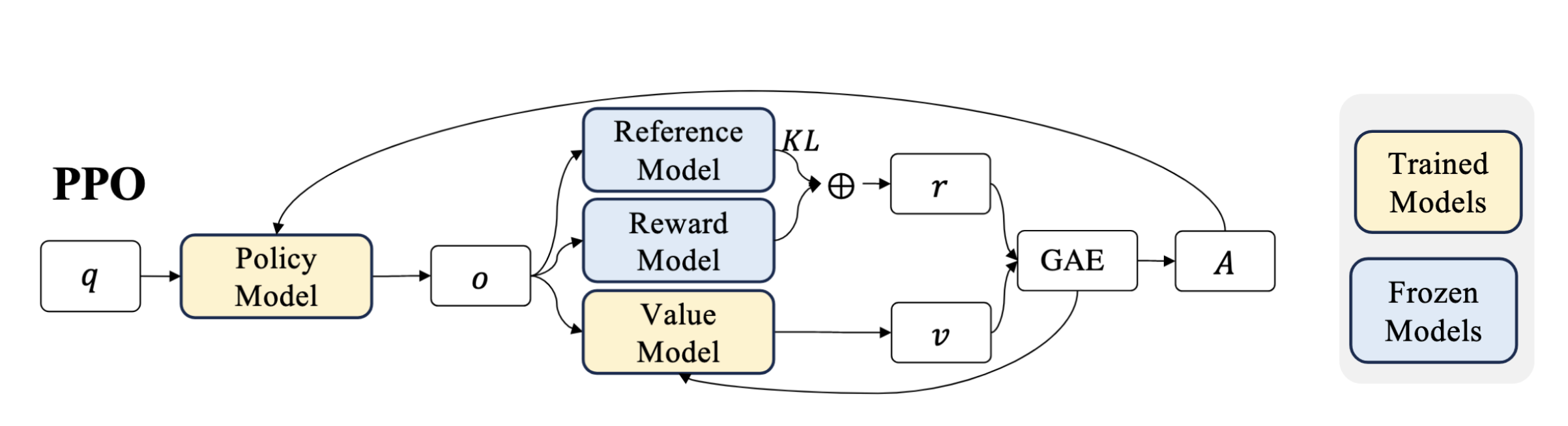 PPO has four main parts, the trained policy model, anchor, and value networks, and reward function.