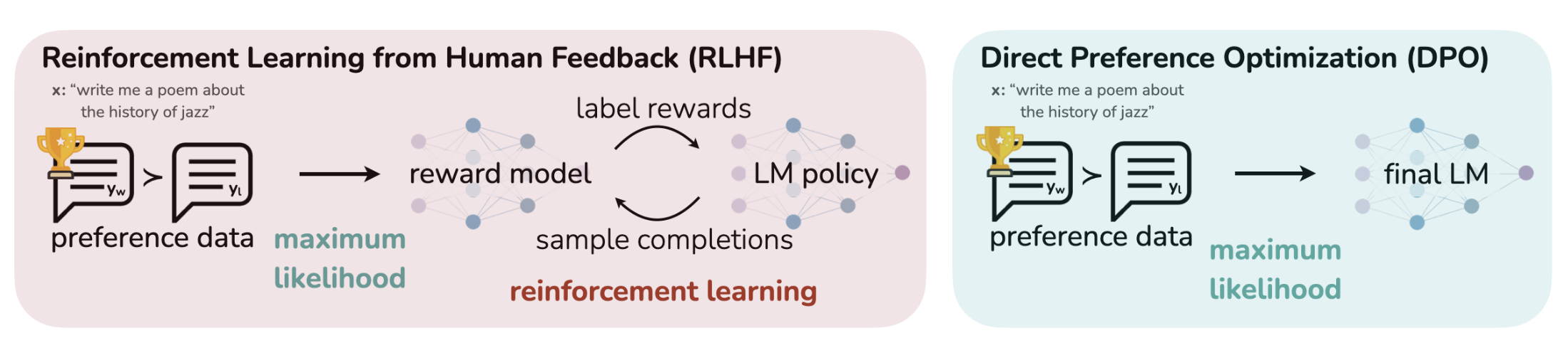 Fig. 31 DPO compared to traditional RLHF. Note the simplicity of the direct update which bypasses the need for an explicit reward model. RSM+24#